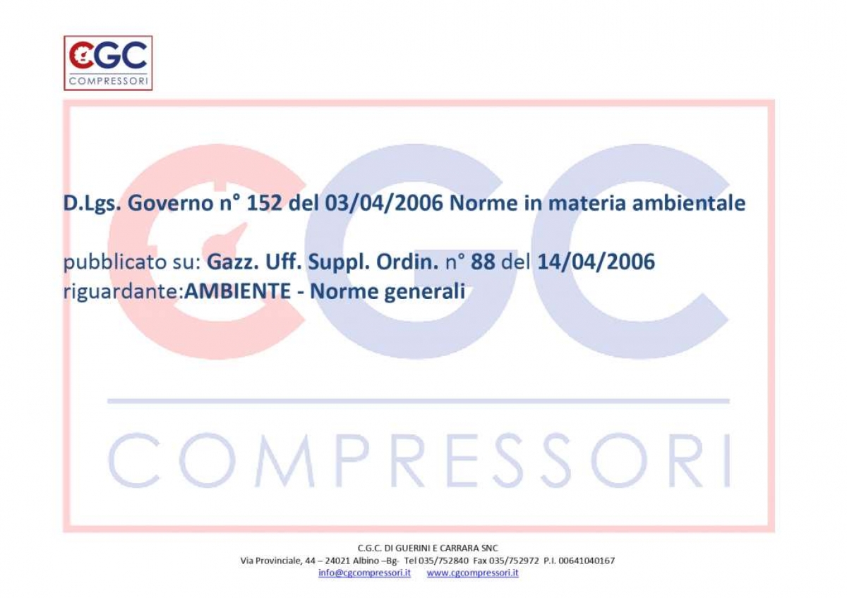 INAIL - applicativo CIVA Classi di purezza dell'aria compressa Valvole di sicurezza e serbatoi, hanno una scadenza? Industria 4.0 Smaltimento condense - normativa tutela delle acque dall'inquinamento e di gestione delle risorse idriche Smaltimento condense - normativa tutela delle acque dall'inquinamento e di gestione delle risorse idriche CONDIVIDI Il trattamento dell'olio contenuto nella condensa non è solo una buona pratica, ma è anche un requisito legale. Per tutte le informazione consultare il pdf inerente al D.Lgs. Governo n° 152 del 03/04/2006 Norme in materia ambientalepubblicato su: Gazz. Uff. Suppl. Ordin. n° 88 del 14/04/2006riguardante:AMBIENTE - Norme generali DOWNLOAD (12916-dlgs-152-2006-e-modif.pdf)